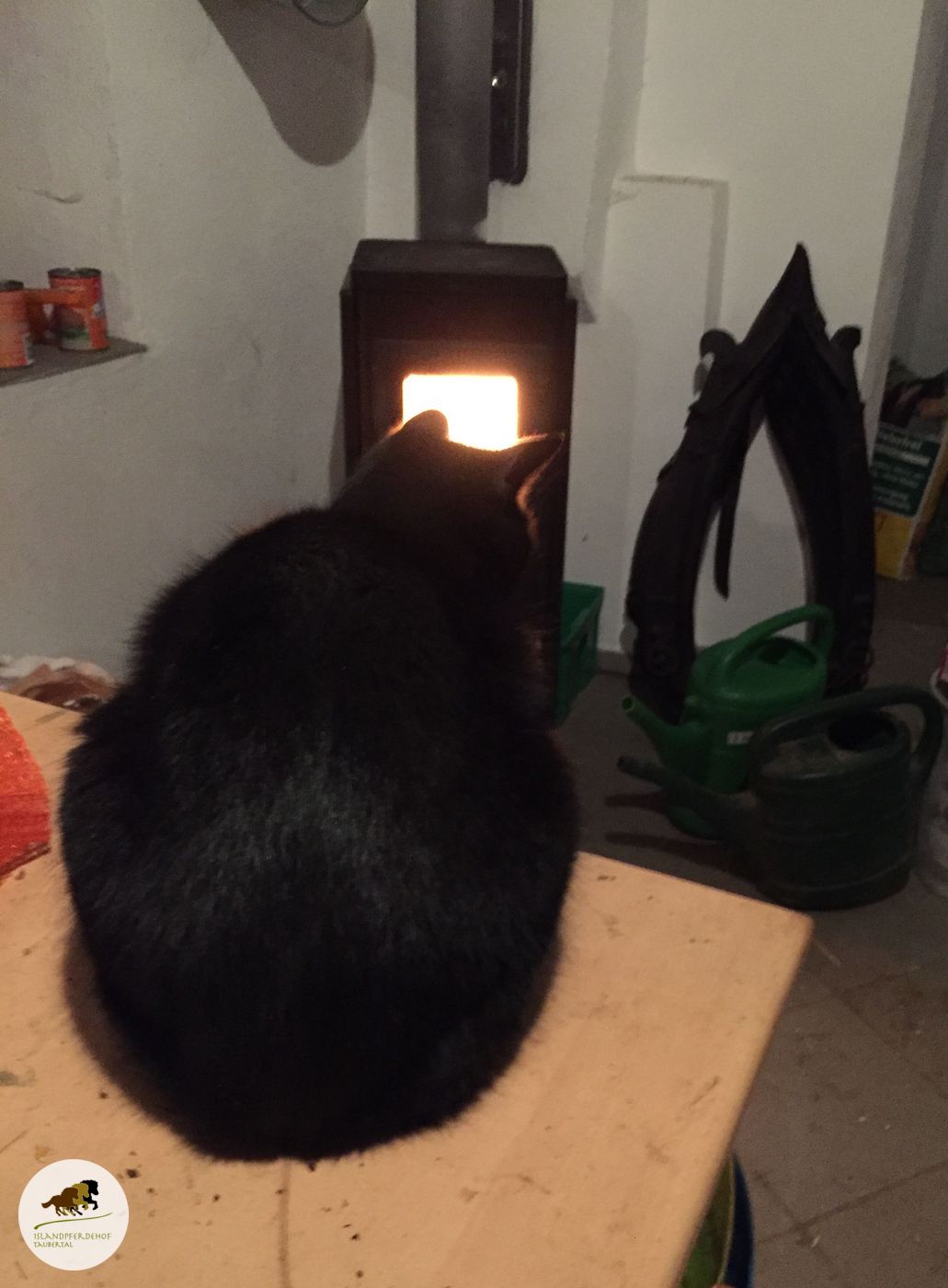 Es ist kalt geworden. Damit die Kater eine kleine Freude haben, haben wir heute den Holzofen im Reiterstübchen angefeuert.