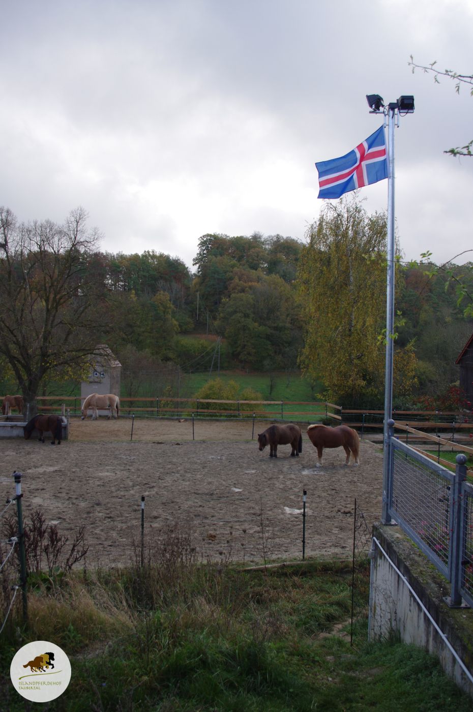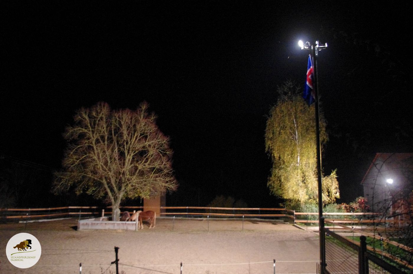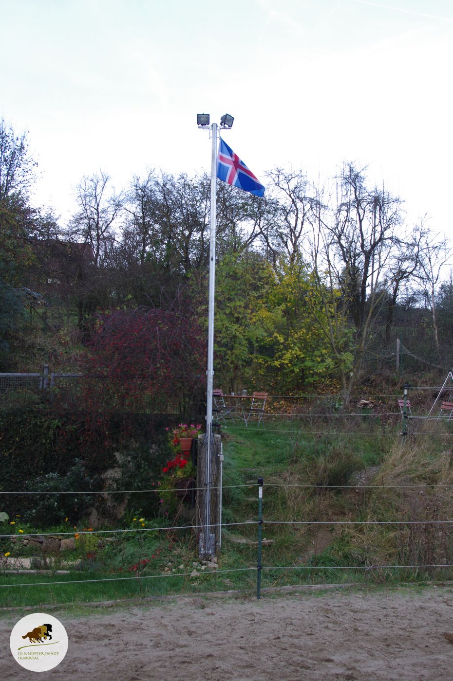 Und weil wir ein Islandpferdehof sind, haben wir die Chance genutzt und auch gleich eine Islandflagge angebracht. Wir finden, das steht dem schönen Flutlicht-Mast sehr gut.