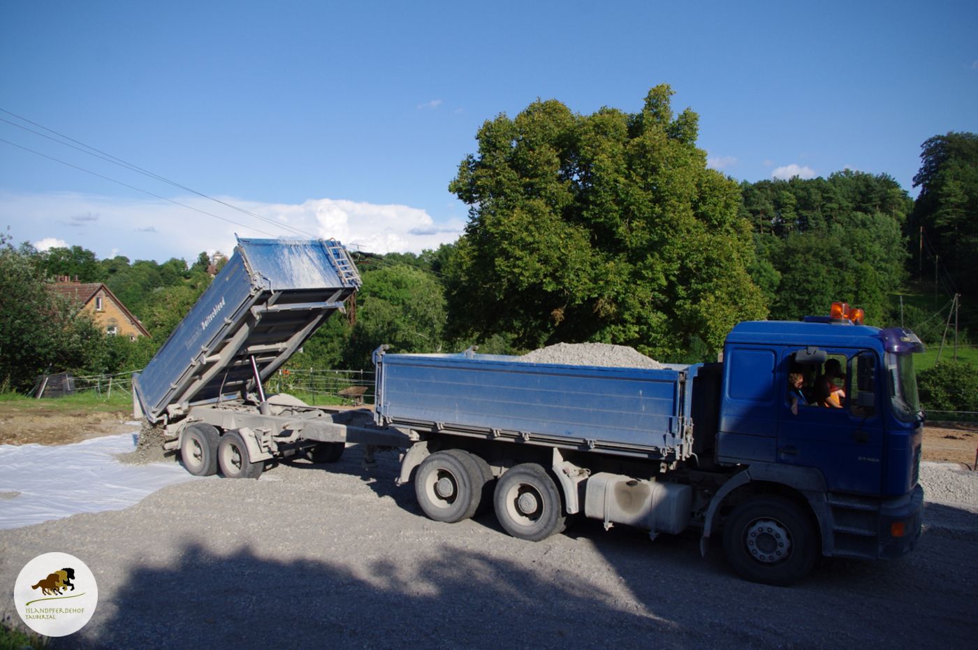 Auf das Vlies wurden tonnenweise Mineral als Reitplatzuntergrund gelegt. Diese erste Schicht wurde mit einem lasergesteuerten Hobel perfekt eingeebnet, wir man auf den Fotos erkennen kann.