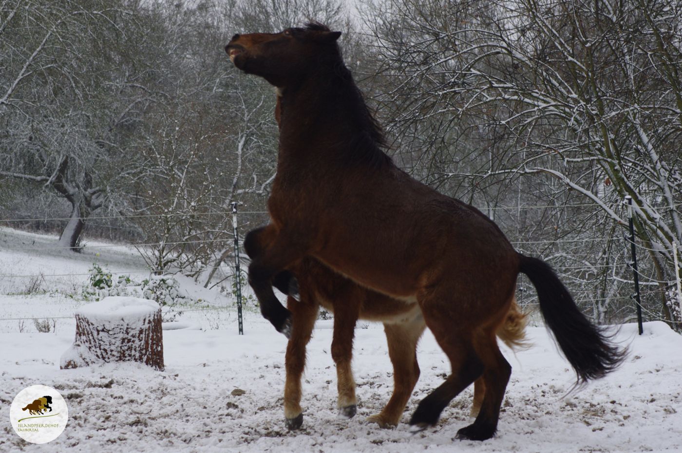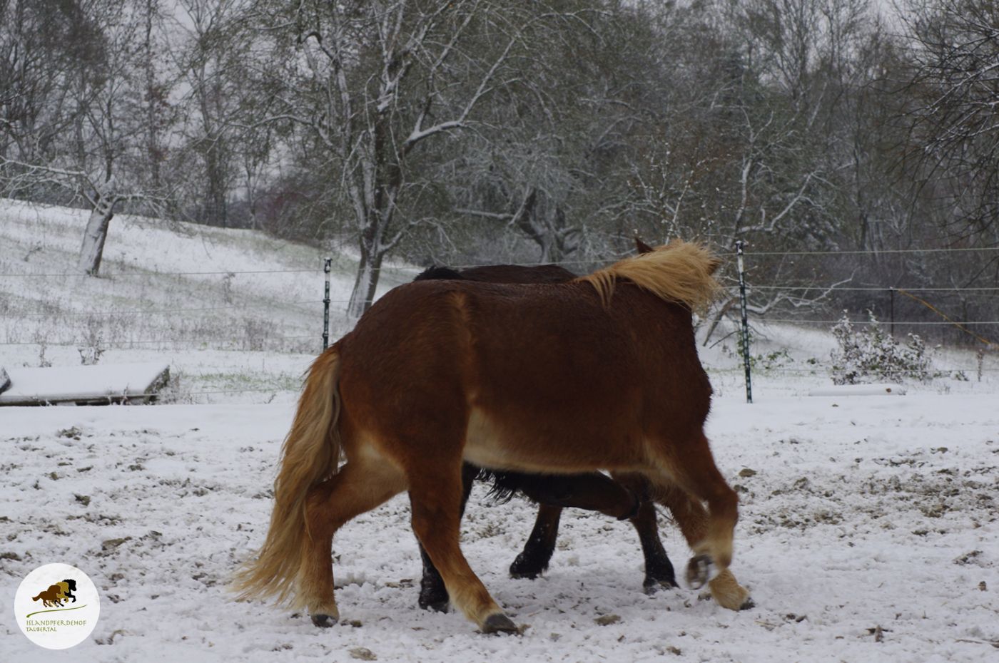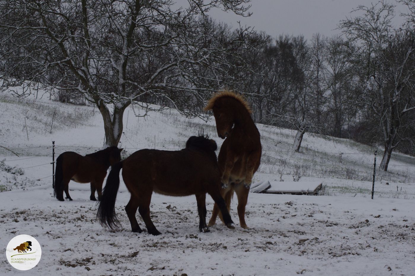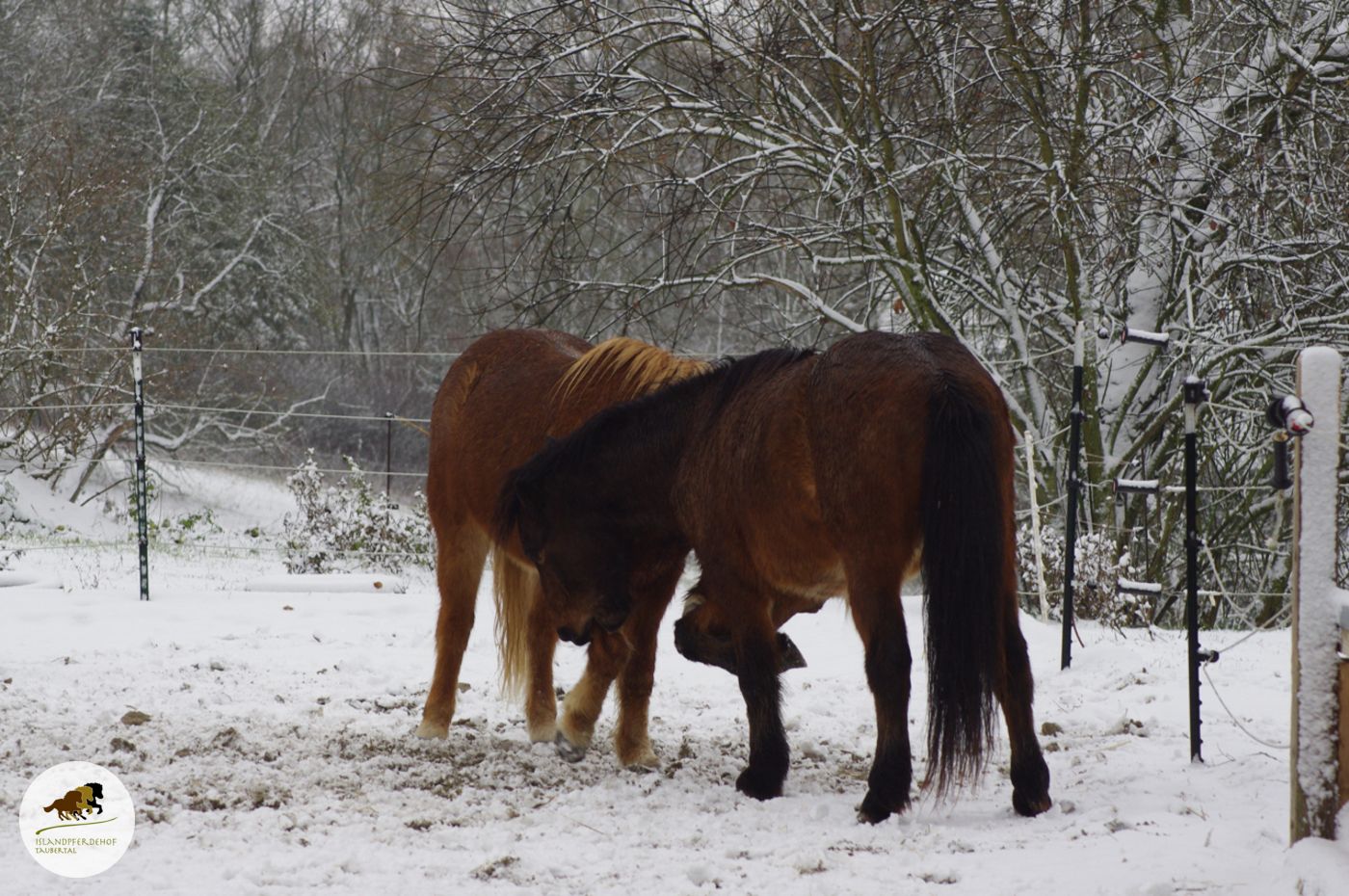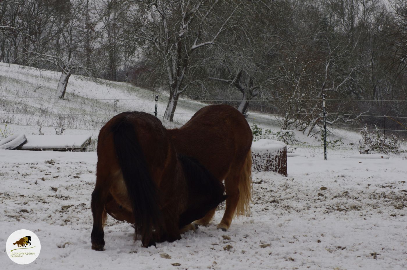 So haben die Islandponys den ersten Schnee am Samstag genossen. Man beachte, wo so ein Pony-Kopf überall hinkommt.